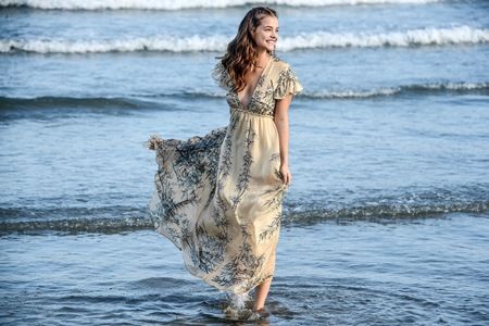 伊ファッションブランドPhilosophyのプロモーションだったこの日、Philosophyのエアリーなドレスを着て登場。大勢のカメラマンをビーチまで先導すると、波打ち際で次々とポージングを始めた。