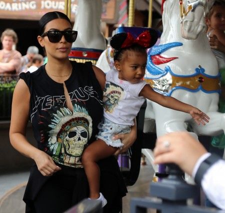 リアリティスターのキム・カーダシアンは、娘のノースウエストちゃんと、父であり夫のカニエ・ウェストが2013年に行ったYeezusツアーのTシャツをアレンジしておソロいに。