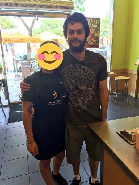 LAの人気ジュース店、ジャンバ・ジュースで働くファンが店にやってきたディランを発見。すかさず記念撮影をお願いすると、ディランは快く応じてくれた。