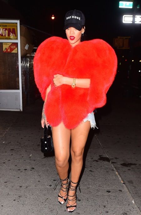 ラッパーのドレイクとのロマンスで騒がせているシンガーのリアーナが、巨大なハート形のケープを身に着けて夜遊びに出かけ、しかもお気に入りのパパラッチを誘ってクラブに行き、話題を呼んでいる。
