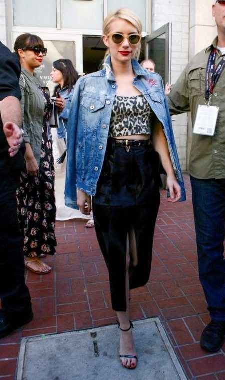 Noir Sachin & Babiのクロップト丈のレオパードキャミにAGのGジャンを肩掛けしてこなれ感を。スリットスカートで脚見せして大人っぽさを演出して。