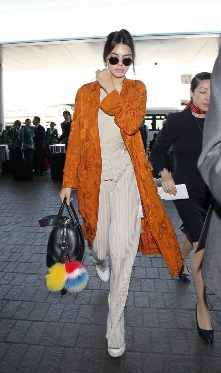 ベージュのニットセットアップに微かにオリエンタル柄が入ったキモノ風ガウンをさらりと羽織って。足元はスニーカーでラフに。バッグにつけたファーチャームで色をプラス。