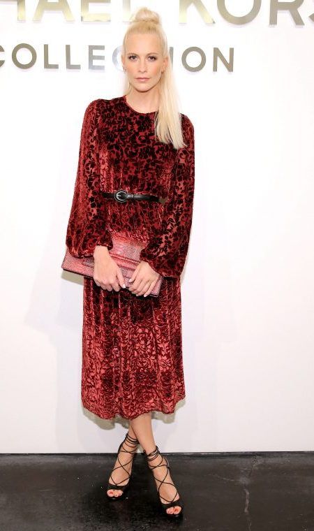 イギリス人ファッショニスタのポピーはシースルー素材にベロアのダマスク柄がラグジュアリーなMichael Korsのワンピースで。足元はレースアップシューズで軽さを。