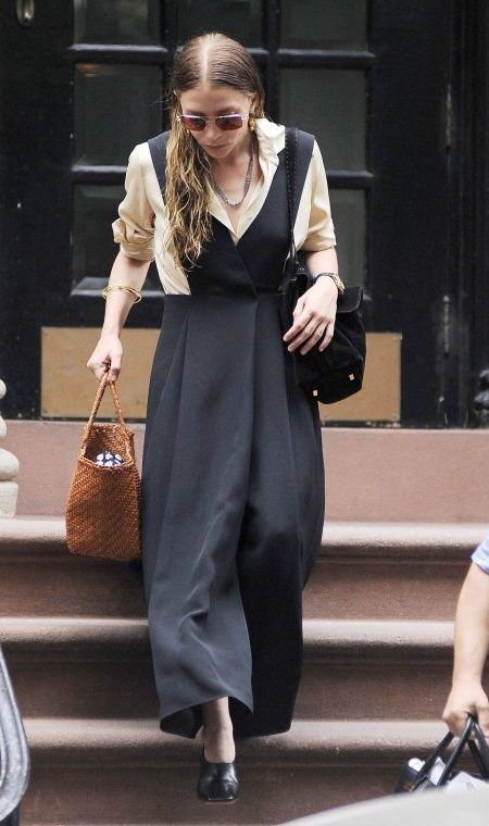 プリーツとY字のサスペンダー部分が特徴的なマキシ丈のジャンパースカートにクリームベージュのシャツを重ねて。白を選ばず、あえて柔らかい色を持ってきたことでモードに傾きすぎない脱力感のある大人カジュアルが完成。