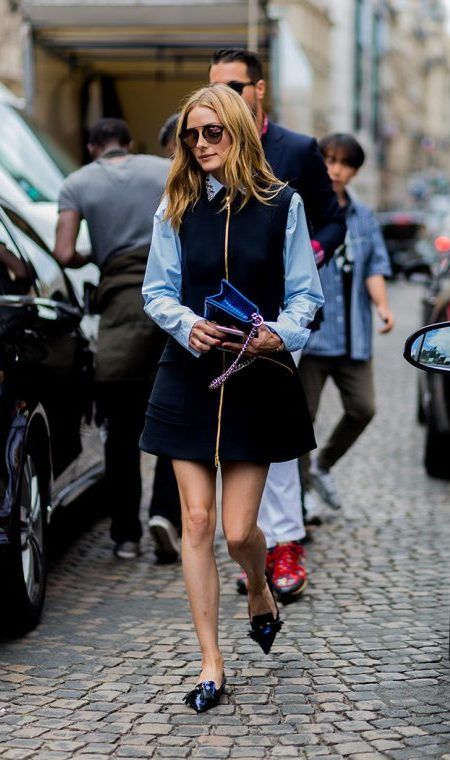 ジップアップのジャンパースカートのINに襟にビジューがついたブルーのボタンダウンシャツをレイヤードしてきちんと感と可愛らしさを両立したコーデに。バッグと靴もブルー系でまとめて。