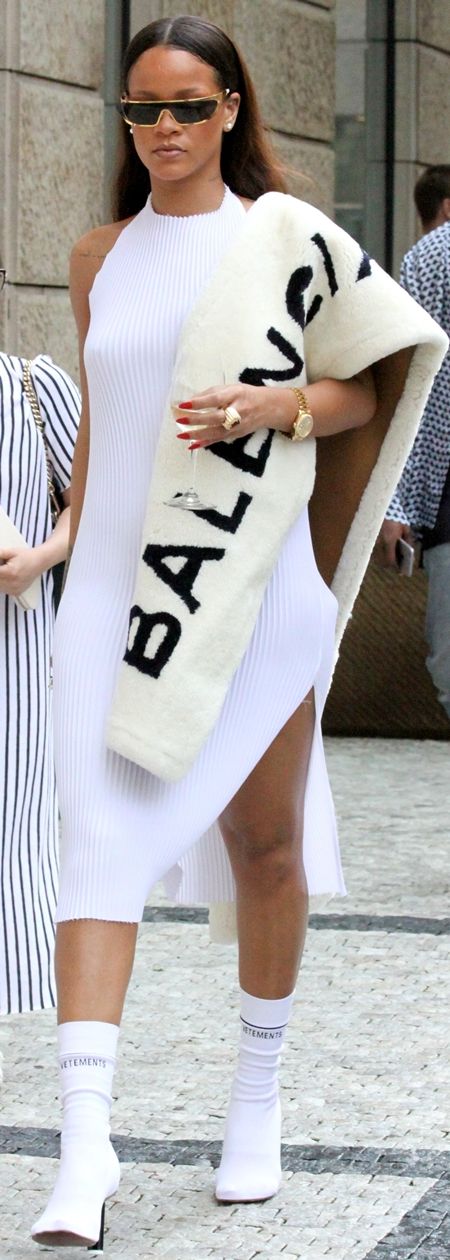 Faustine Steinmetzの全身プリーツの白ワンピースは、Balenciagaのファーを肩からかけて。Vetementsのソックスブーツでモードに。