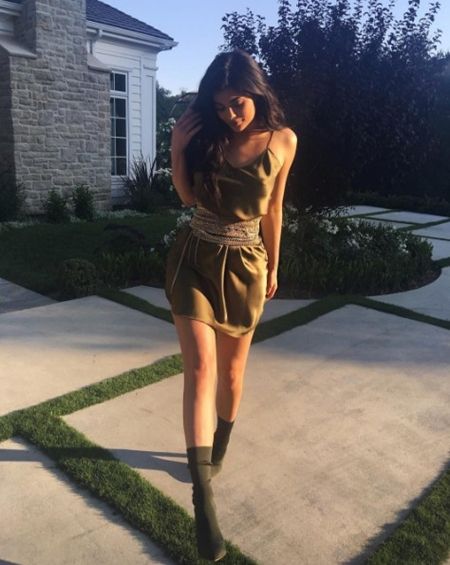 オリーブカラーが綺麗なNili Lotanのキャミソールワンピースは、同じくオリーブカラーのソックスブーツで統一して。ブーツはYeezy。