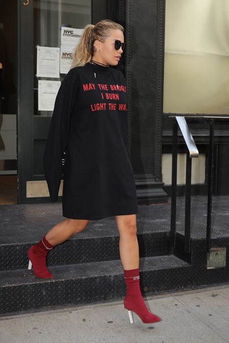 Vetementsの黒のオーバーサイズTシャツをワンピ風に着て、同ブランドのソックスブーツをセット。Tシャツロゴとブーツの色をシンクロして。