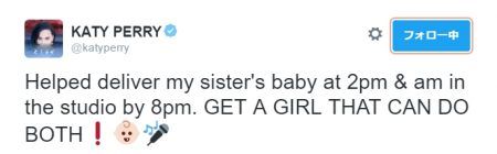 シンガーのケイティ・ペリーが昨日(9月12日)、姉のアンジェラの出産を手伝ったことを自身のツイッターでファンに報告した。