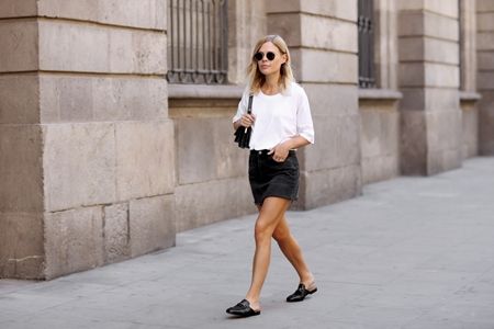 白Tに黒のデニムスカート、黒バッグを合わせたシンプルスタイルも、Gucciのバックレスシューズでぐんと今年っぽく。