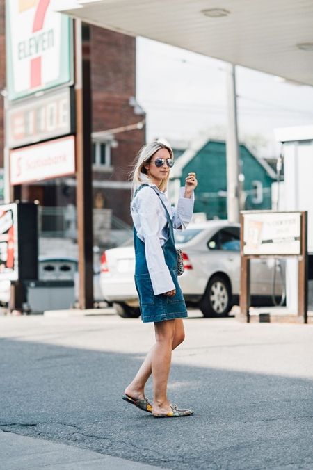 オーバーオールにトレンドのステートメントスリーヴシャツをセットしたスタイルに、オリエンタル柄が可愛いGucciのバックレスシューズでトレンド満載のスタイル。