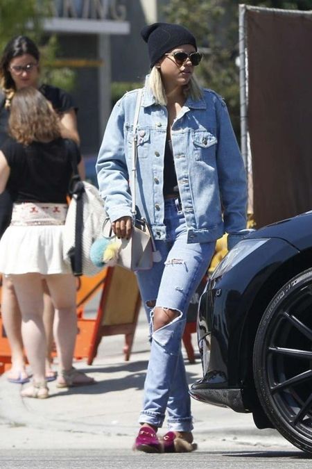 オーバーサイズジャケットにダメージデニムを合わせたメンズライクなデニム・オン・デニムに、Gucciのベルベッドバックレスシューズで変化球を。