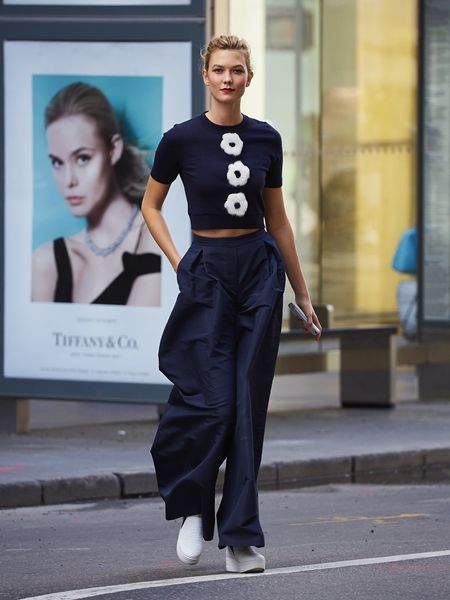自身も多くのショーに出演しているカーリーは、立体的なフラワーが可愛いネイビーのクロップトTを、Carolina Herreraのワイドパンツにセットしてラフに。