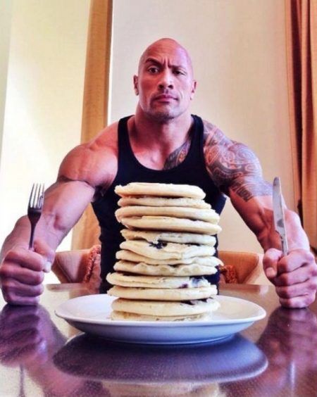2016年度版の「世界で最も稼ぐ俳優」ランキングのトップに輝いた肉体派俳優のドウェインは、普段のゴリゴリのワークアウトに比例してチートデイに食べる量もハンパない! 空手の瓦割りのように積まれたパンケーキに「いただきます!」。