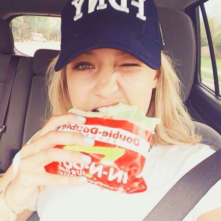 モデルのジジは、セレブに大人気のハンバーガー・ショップ、In-N-Outのハンバーグとチーズが2倍のダブル・ダブル・バーガーを待ちきれず車の中でガブリ!