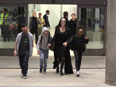 今年7月パックス、シャイロ、ザハラを連れてLAXの空港から出てきたアンジェリーナ。