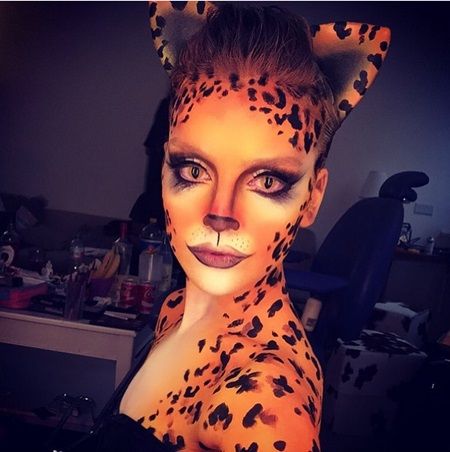 リトルミックスのペリーは、細かい柄まで再現したフェイス&ボディペイントでチーターに。上手く髪の毛で根元を隠した耳は、頭から生えているようにしか見えない。