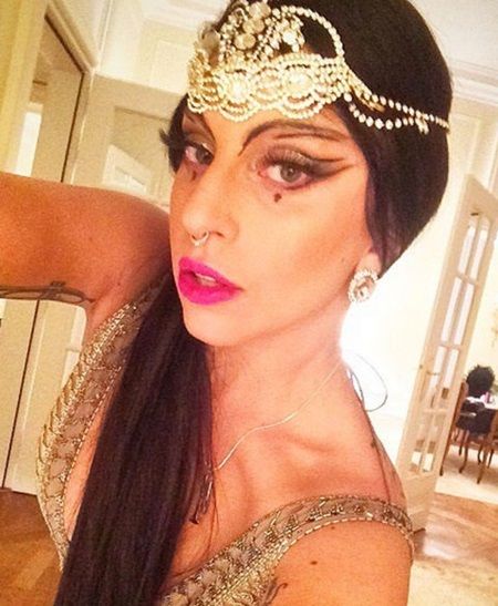 ガガはアラビアン風メイクで妖艶な雰囲気に。ヘッドアクセと、大げさに何本も引いたアイラインで顔の印象をチェンジ。ノーズシャドウやブロンザーで顔に陰影をつければ、より一層エキゾチックな顔立ちに。