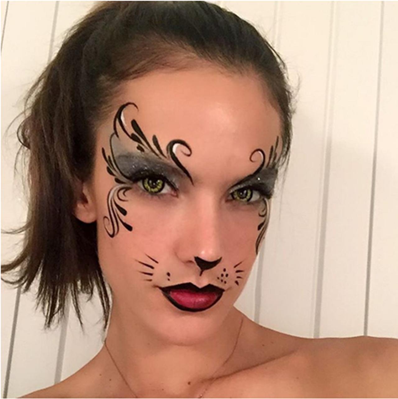 モデルのアレッサンドラはセクシーな猫に変身。イエローのカラコンに目元と口元のフェイスペイントが大人で色っぽい印象。