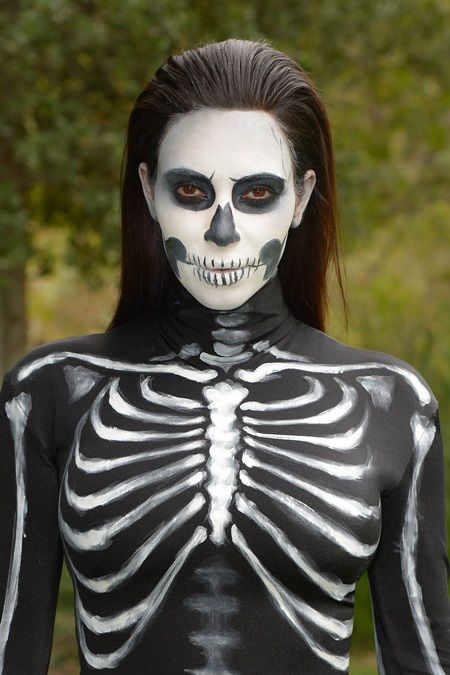 マリリン・モンローの仮装に、さらにガイコツのボディペイントを足したモデルのケイト。コスチュームを着る予定のない人は、ケイトのように手や腕にボディペイントをするだけで、一気にハロウィン仕様に。