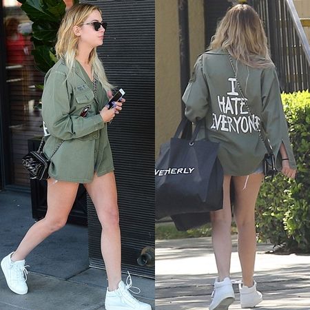 ドラマ『プリティ・リトル・ライアーズ』の女優アシュレイは、「I HATE EVERYONE(みんな大嫌い)」と反抗心剥き出しなユーモアのあるメッセージがペイントされたJack Vanekのアーミージャケットがお気に入り。デニムショーパンにGiuseppe Zannottiの白レザースニーカーですっきりまとめて。