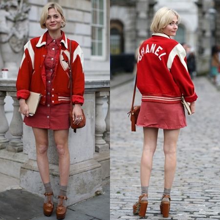 ストリートスナップの常連のファッションブロガーのパンドラは、背中に大きくブランドロゴが入ったヴィンテージ風のCHANELのスタジャンを主役に全体を赤~キャメルでまとめてレトロガーリーなコーデに。