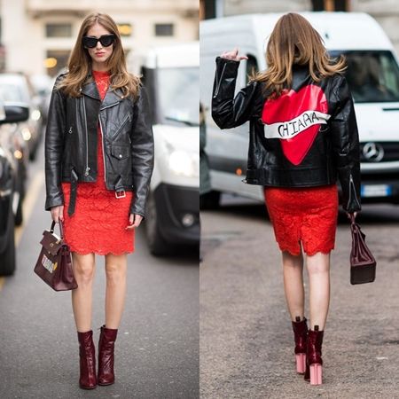世界一稼ぐブロガーのキアラはハートマークと自分の名前が大きくペイントされたJayDeeのカスタム・レザージャケットでValentinoの上品な赤レースワンピをカジュアルダウン。HermèsのケリーバッグにもAnya Hindmarchのアルファベット・レザーステッカーで自分の名前をON。