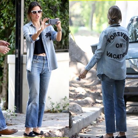 クロップトフレアデニムに左胸にヤシの木パッチがついたデニムシャツをさらりと羽織ってダブルデニム・コーデを楽しんだヴィクシーモデルのアレッサンドラ。背中に「FOREVER ON VACATION(永遠に休暇中)」と入ったこのシャツはセレブに人気のアクセブランドJacquie AicheがデニムブランドMotherとコラボしたもの。