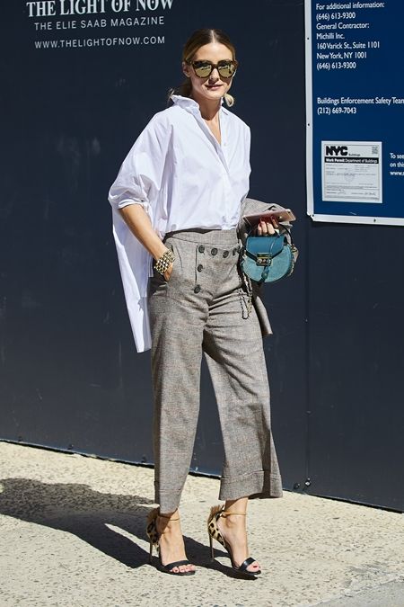 Olivia Palermo+Chelsea28の白のステートメントシャツをINさせ、Francesco Russoのレオパードサンダルをセット。これからの季節にぴったりなSalarの深いグリーンのスエードバッグがマッチ。