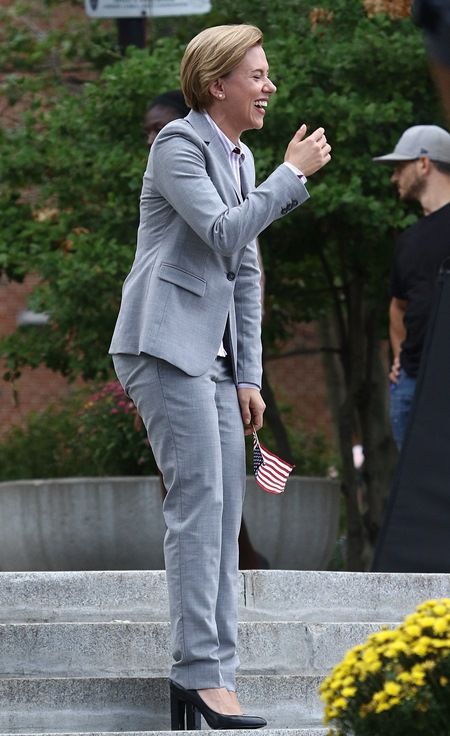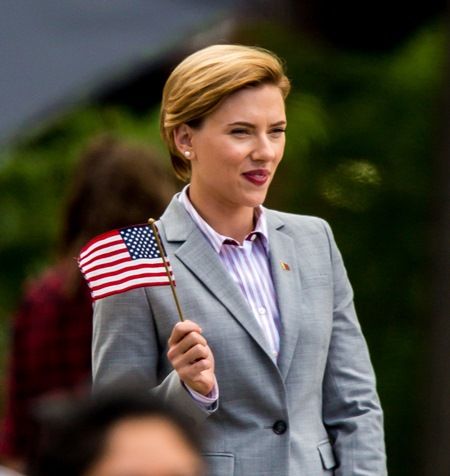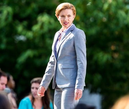 『アベンジャーズ』女優スカーレット・ヨハンソン、政治家風スーツ姿で別人
