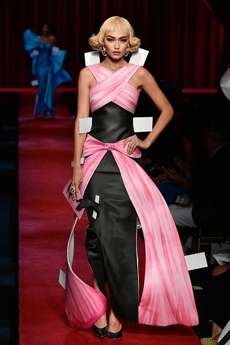 オープニングを務めた姉のジジは、ブラックのランジェリーを身に着けた女性の体がプリントされた2D風のドレスを着て登場。ほかのモデル同様、ヘアはレトロなスタイルにまとめられていた。