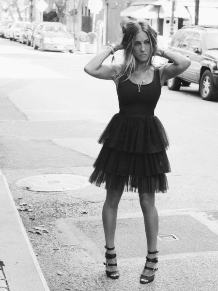 そう、今回のコレクションのコンセプトに合わせて、色こそブラックなものの、ドラマ版『SATC』のあのお馴染みのオープニング映像でキャリーが着用していたピンクのタンクトップ+ホワイトの3段チュールスカートの衣装にそっくり!