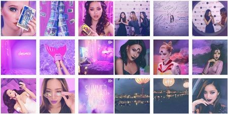 チャンネル登録者数870万人以上の人気ユーチューバーであり、プロのメイクアップアーティストでもあるミシェルは、写真を同じ色のフィルターで加工することで統一感を演出。次の色に変わるときには、その色に少し近づけグラデーションにしてつなぎ目を曖昧にするという上級テクニックも使用している。