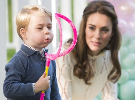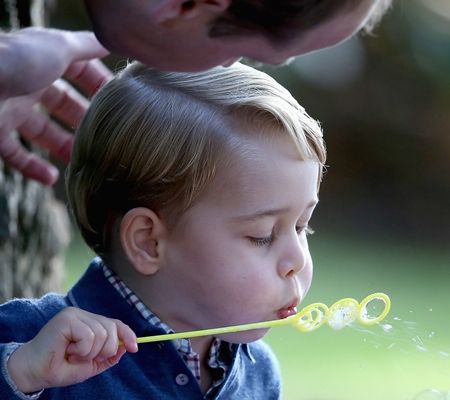 父親のウィリアム王子に教えてもらいながらシャボン玉にチャレンジ。