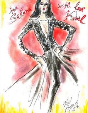 Chanelを手がける大御所デザイナーのカール・ラガーフェルドがセレーナのためにデザイン。全面スパンコールのトップスの輝きとラバーパンツのツヤ感に、腰から流れ落ちるシースルーがドラマチック。