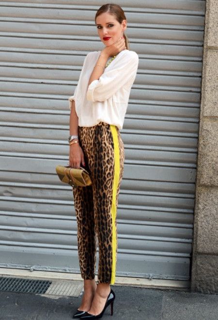 サイドにイエローのラインが入ったレオパードパンツは、とろみ感のあるフェミニンなシャツでボトムの強さを中和して。