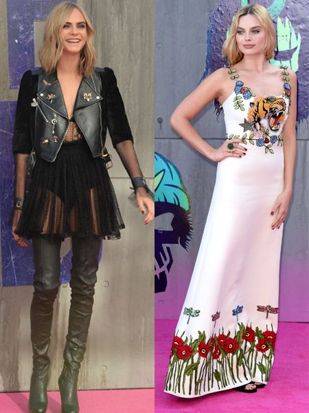 邪悪な魔女エンチャントレスを演じたカーラはAlexander McQueenのチュール素材のベビードールワンピースにジュエリーピンがたくさんついたレザージャケットを合わせたクールなスタイル。ファンキーな悪女ハーレイ・クインを演じたマーゴットは虎と花の刺繍が特徴のGucciの白ドレスで。