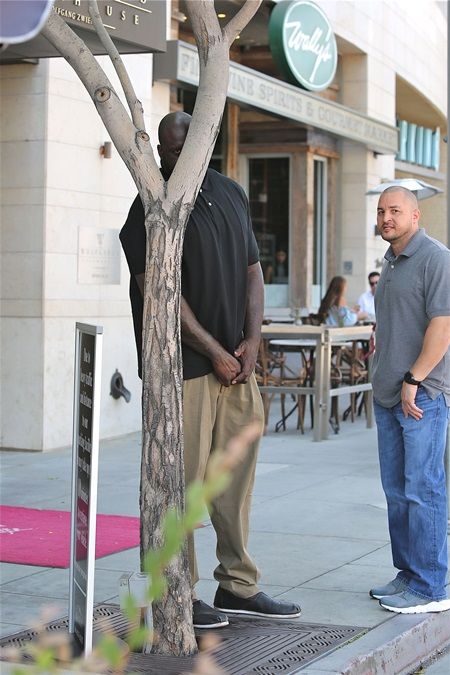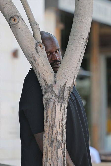 食事をしてレストランから出てきた彼は、カメラマンを見つけると木の後ろにさっと隠れるパフォーマンスをしたものの、そこは2メートル16センチの巨体を持つシャキール。体はまったく木で隠れることなく、カメラマンからは笑いが起こった。
