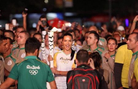 満面の笑顔で聖火を持つアドリアナ。感極まって泣いているシーンも見られた。