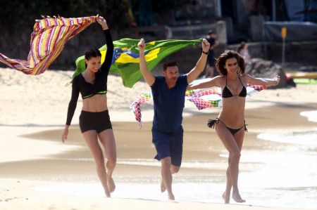 番組司会者のライアンと共にブラジルの国旗を持ち、美しいベルメーリャ海岸を紹介。