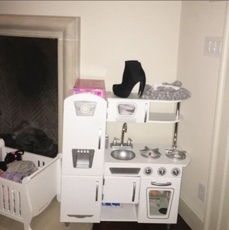 ハーパーちゃんの「おもちゃコーナー」に置かれているのは、白いヴィンテージ風のままごとキッチン。フロントロウ編集部の調べでこれはアメリカのKidKraftの商品であることが分かっていて、お値段は約1万6,000円。