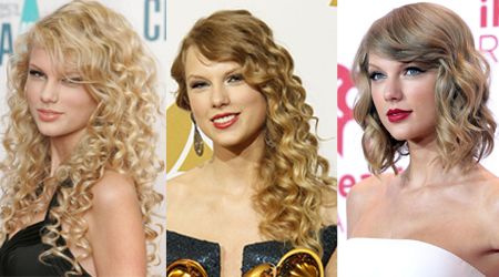 左から2006年のデビュー当時、2010年のグラミー賞で4冠を達成した頃、そして、テイラーが2014年に最後にくるくるカーリーヘアで登場したiHeartRadioフェスティバルでの写真。