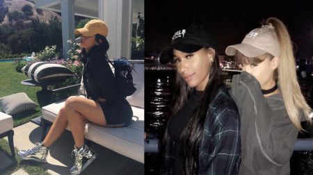 アメリカの10代~20代のカリスマ、カイリー・ジェンナーもダッド・ハットがお気に入り。 右:先日アリアナ・グランデがポニーテールを引っ張り出す穴を開けてかぶっていたのもダッド・ハット。