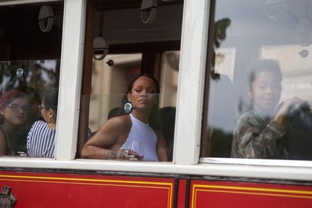 ヨーロッパ公演中のリアーナ。プラハでは路面電車を利用。