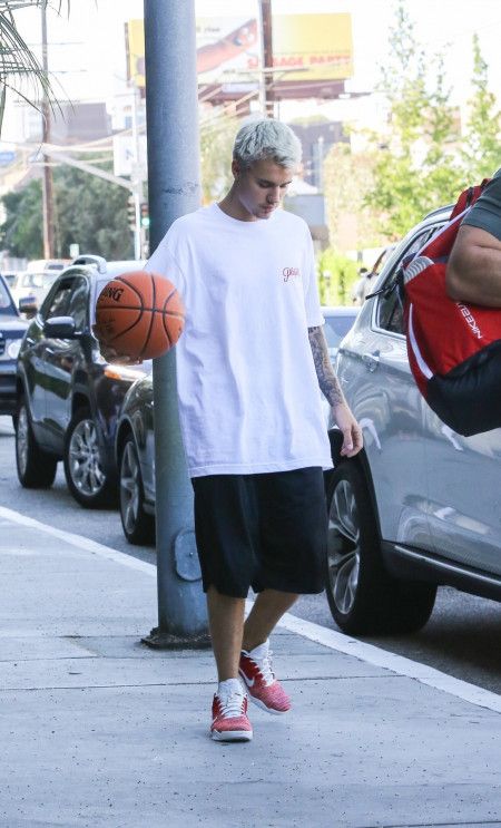 バスケットボールをしに出かけたジャスティン。オーバーサイズなTシャツとハーフパンツのスタイルは、Tシャツの赤ロゴとスニーカーの色をさりげなくリンク。