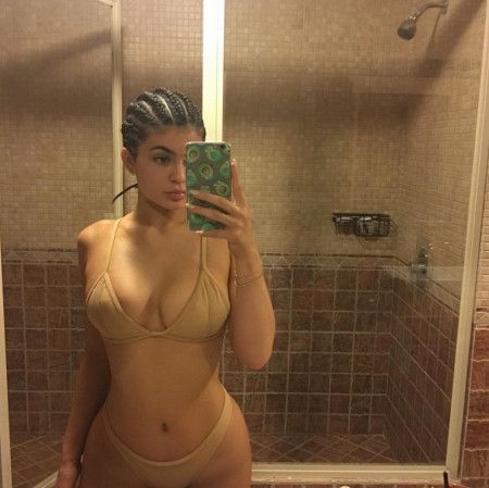 Mint Swimの肌色にかなり近いヌードベージュの三角ビキニを着てバスルームでセルフィーをパチリ! 髪は根元から細く編み込んだコーンロウヘアですっきりとまとめて。