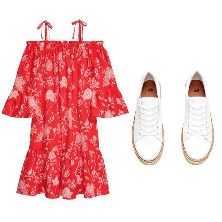【H&M】オフショルダーワンピース(¥1,499)+フェイクレザースニーカー(¥4,999)