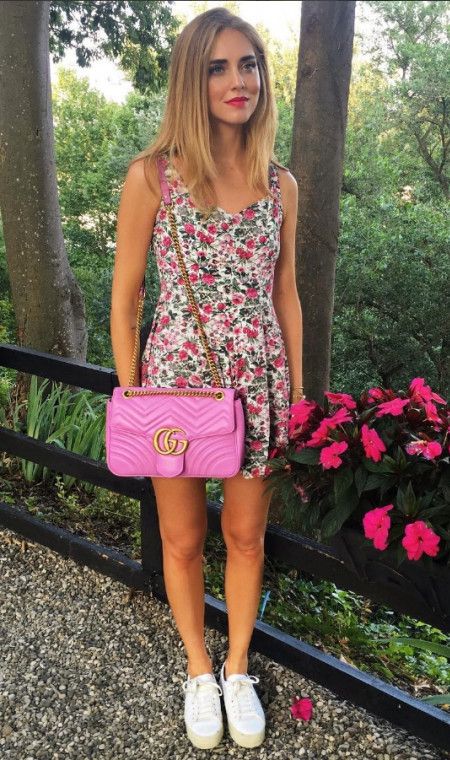ピンクの小さなローズプリントがガーリーな90s風のノースリーブワンピにキャンバス地のプラットフォームスニーカーを合わせた世界一稼ぐブロガーのキアラ。柄の色とリンクさせたバッグはGucci。
