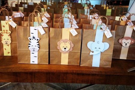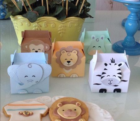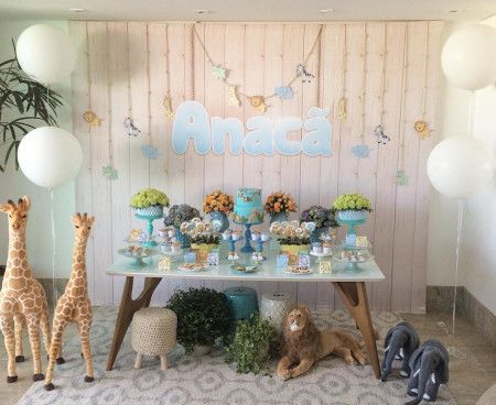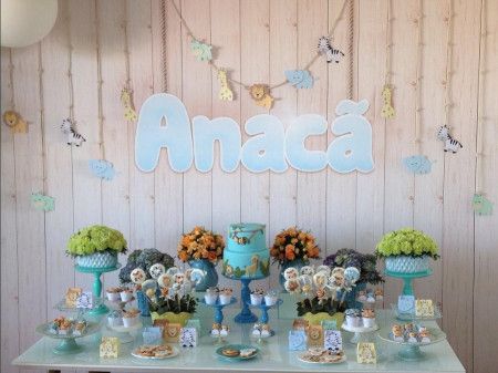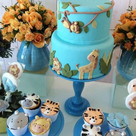 ブルーとイエローをベースにカラーコーディネート。ケーキやカップケーキにもキュートな動物たちのデコレーションが。