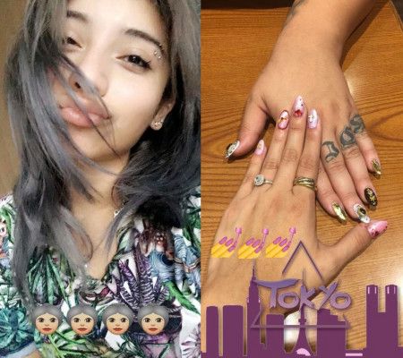 来日直前にクールなグレーヘアにイメチェンしたカースティン。ネイルも東京仕様にデコって気合充分!
